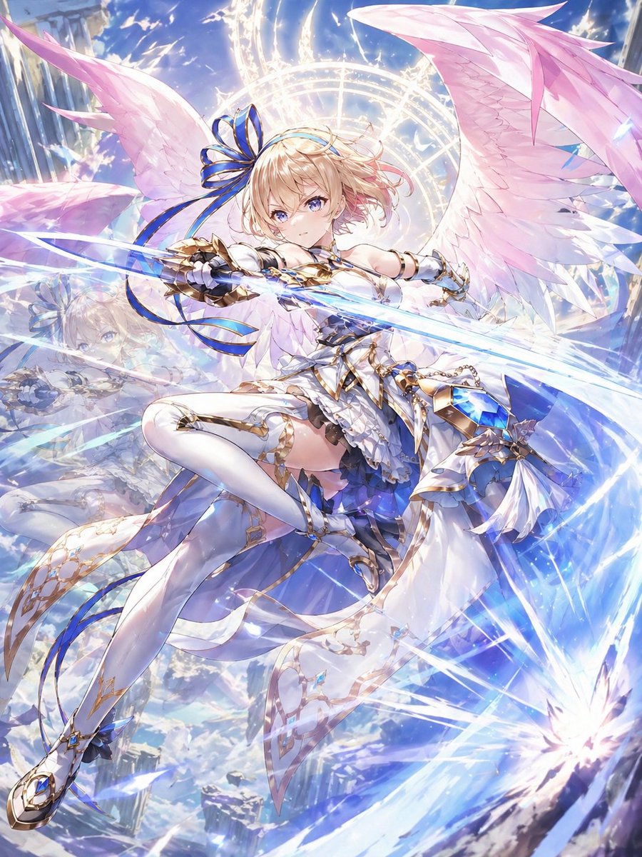 A cinematic dark fantasy anime illustration in a ruined gothic cathedral, vertical composition. Show a lone female android-like warrior from behind, centered slightly low in frame, kneeling or sitting back on her heels on a reflective stone floor. She has extremely long flowing {argument name="hair color" default="silver white"} hair spreading across the floor and air, a sleek black blindfold visor covering her eyes, and a black high-cut gothic combat dress with elegant straps, long black opera gloves, and thigh-high black boots. Her physique is slim and graceful. She holds 1 large ornate sword upright in front of her, with both hands resting on the hilt, the blade planted on the ground like a memorial. The sword has a dark blade and a decorative gold ring-like guard near the handle. The atmosphere is solemn, tragic, and reverent. Place 3 tall pointed arched windows in the background, glowing with cold white backlight through haze and dust. Include 4 stone angel statues total: 2 larger angels in the left background and 2 in the right background, partially obscured by fog and darkness. Fill the air with drifting ash, snow-like particles, black debris fragments, and a few faint orange embers near the floor. Use dramatic volumetric light rays, soft bloom, smoky mist, high contrast, and a desaturated palette of charcoal gray, silver, blue-gray, and black. The scene should feel like a memorial after a battle, highly detailed, ultra-polished, melancholic, ethereal, and game key art inspired by {argument name="franchise title" default="NieR:Automata"}. Add 1 vertical Japanese title inscription near the lower left reading {argument name="vertical text" default="儚き夢と共にあれ"}, with 1 small vertical English subtitle beside it reading {argument name="subtitle text" default="NieR:Automata"}.