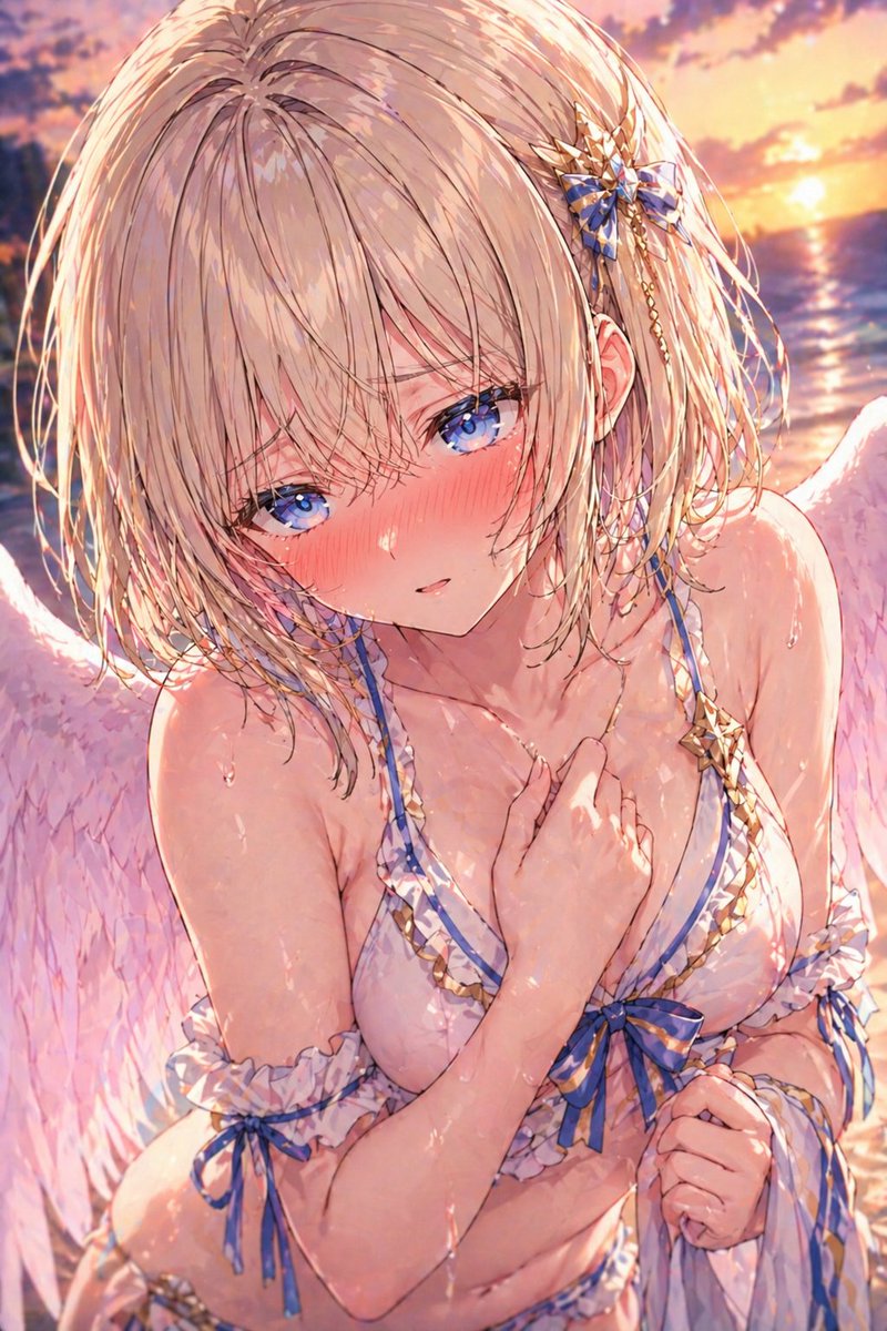 A polished anime-style portrait of {argument name="character" default="a blonde female VTuber-inspired maid"} seated indoors in a cozy sunlit cafe, framed from upper thighs to head in a slightly high, intimate angle. She has short to medium-length tousled {argument name="hair color" default="golden blonde"} hair with soft layers, a white frilled maid headband, and a teal ribbon hair accessory with a small gold ornament on the right side. Her face is mostly obscured by the hair falling forward, creating a mysterious hidden-face composition. She wears an elegant black-and-white maid dress with puff sleeves, white ruffles, gold trim, a fitted bodice, a white apron, and a large white waist bow visible at the side and back. Add 2 teal bows with gold star-like charms: 1 at the collar and 1 on the wrist. Her right hand gently touches the bow at her chest, and her left hand is raised delicately near her shoulder holding a loose strand of hair. Include a frilly lace garter on her exposed thigh with a small teal-and-gold ribbon decoration. The background is a warmly lit European-style cafe interior with wooden beams, framed botanical art on the walls, a softly blurred cake stand on the left, window light streaming in, and tiny glowing dust-like sparkles in the air. Use soft golden afternoon lighting, shallow depth of field, glossy detailed fabric rendering, delicate skin shading, subtle romantic atmosphere, and highly detailed refined anime illustration quality.