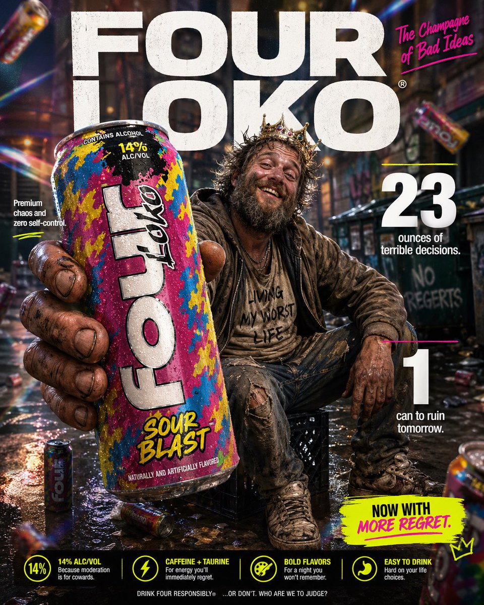 High-impact parody e-commerce infographic for “{argument name="product" default="Four Loko"}” malt beverage. Foreground: An extreme close-up of a rough, weathered hand holding a tall, brightly colored can of {argument name="product" default="Four Loko"} toward the camera. The can is slightly cold with visible condensation droplets and a loud, chaotic flavor design. The hand and can have a slight macro-lens blur for depth, with the can still reading clearly as the hero product. Central Subject: In the mid-ground, a funny, disheveled {argument name="subject" default="homeless-looking man"} sitting casually on a milk crate in an urban alley. He has a scruffy beard, messy hair, layered worn clothing, and a huge unbothered grin. He should look chaotic but oddly charismatic, like the accidental king of bad decisions. He is posed like a confident lifestyle-ad model, proudly showing off the can. Background & Lighting: A ridiculously polished ad-style backdrop mixed with a grimy city alley setting. Soft-focus urban textures, dumpster shapes, graffiti hints, and scattered clutter in the distance. Add dramatic studio lighting, soft glow, rainbow prism flares, and subtle light leaks to make the whole thing look way too premium for the subject matter. A few blurred {argument name="product" default="Four Loko"} cans can float artistically in the background for extra absurdity. Typography & Layout (Bold sans-serif, white and neon accent styling): Top Center (Background): Massive, bold text reading “{argument name="brand name" default="FOUR LOKO"}” positioned behind the subject. Top Right: Bold text reading “The Champagne of Bad Ideas”. Mid-Left: “Premium chaos and zero self-control” Mid-Right: Large, bold “23” with the text “ounces of terrible decisions.” Bottom-Right: Large, bold “1" with the text “can to ruin tomorrow.” Optional small callout text near the bottom: “Now with more regret.” Style: Ultra-detailed, 8k parody commercial photography, sharp focus on the can, shallow depth of field, vibrant trashy color palette, clean advertising composition, exaggerated premium product-ad aesthetic, funny visual contrast between polished branding and the wrecked subject.