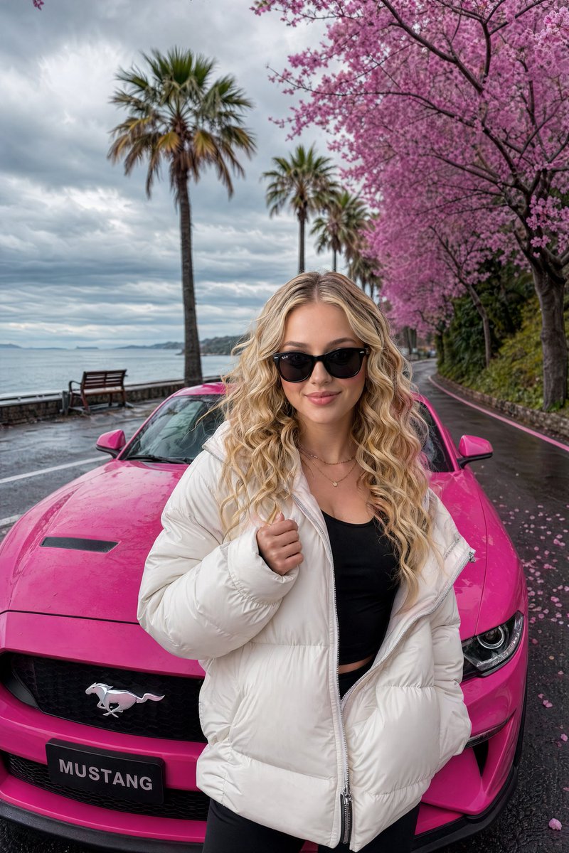 A stylish young woman with {argument name="hair style" default="long wavy blonde hair"}, defined cheekbones, and a confident expression, wearing black sunglasses and a {argument name="clothing" default="thick white puffer jacket"} over a fitted black top, standing confidently in front of a {argument name="car" default="vibrant hot-pink Ford Mustang"}. She is posing with one hand slightly raised near her chest, exuding effortless attitude and elegance. The car is parked on a scenic coastal road lined with blooming pink cherry blossom trees and tall palm trees. Behind them is a calm sea under a dramatic overcast sky with soft clouds. Pink petals are scattered on the wet asphalt. A wooden bench is visible on the left side near the water. Cinematic lighting, photorealistic, ultra-detailed skin texture, natural lighting reflections, Instagram-style luxury lifestyle shot, vibrant colors, moody atmosphere, 8k resolution --ar 9:16 --stylize 250
