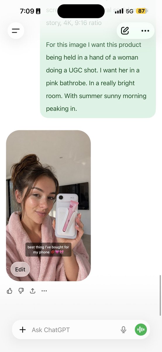 analyze this photo and give me a detailed JSON prompt that recreates it. break down the color grading and every exact color in the photo (use Opus, not Sonnet. Opus has stronger visual analysis and writes more detailed JSON) paste that JSON into ChatGPT upload your product image and prompt: using this JSON as reference, generate a person holding my product save that generated photo as your character reference attach it to every future generation for facial consistency you now have a consistent UGC model that works across any product the JSON controls the lighting and color grading. GPT image-2 handles the character. you control the product placement. the #1 tell on AI photos is flat colors and a grainy look. this method removes both. 5 minutes to set up. unlimited variations after.